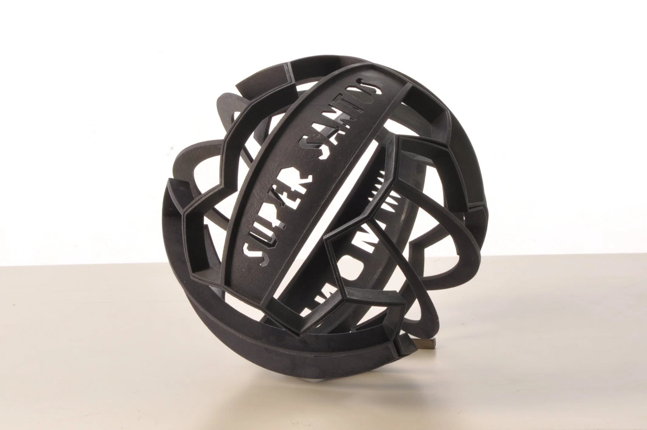 Reinterpretation of the famous football Super Santos for the exhibition "Design nel Pallone", curated by Francesca Molteni and Giulio Iacchetti. In the eternal soccer games that seemed to never end, I remember the Super Santos chiming in every goal the passage of time, with his unmistakable thud of metal on the shutters. This noise was contained in joy and pain: not only represented the sound of the goal, but most likely would have aroused the hatred of the neighbors, who regularly threatened to puncture the balloon so loved. I tried then to design a sphere impossible to drill, an elastic structure outside that could never lose its shape, inspired by the lines that characterize the Super Santos. Prototyped sintered nylon and sheets PPL cut and riveted